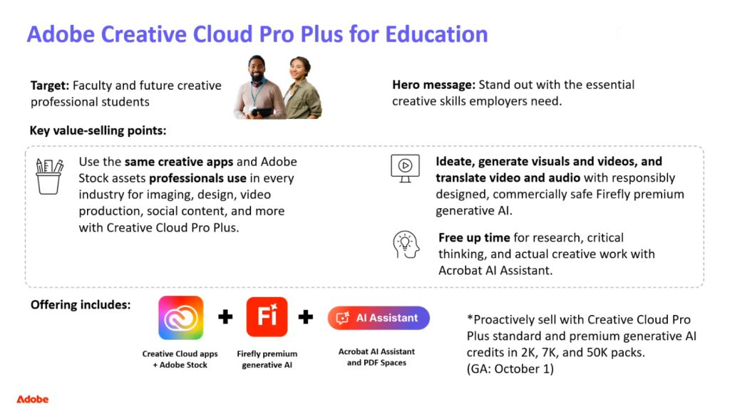 Adobe Creative Cloud Pro Plus on tekoälypohjainen ratkaisu, joka on räätälöity korkea-asteen oppilaitoksille. Se sisältää yli 20 ammattitasoista luovaa sovellusta (muun muassa Creative Cloud – Kaikki sovellukset Pro -jäsenyyden aikaisempien versioiden sovellukset, kuten Adobe Photoshopin, Adobe Expressin, Illustratorin ja Acrobatin) sekä uuden Acrobatin tekoälyavustajan, PDF Spacet ja uusimman Firefly-tekoälyteknologian. Edistyksellisten generatiivisten tekoälytyönkulkujen ansiosta se on huippuluokan työkalupakki tutkimustulosten ja ideoiden luomiseen ja jakamiseen muun muassa kuvien, grafiikoiden, esitysten, videoiden, sivustojen, animaatioiden ja podcastien välityksellä.