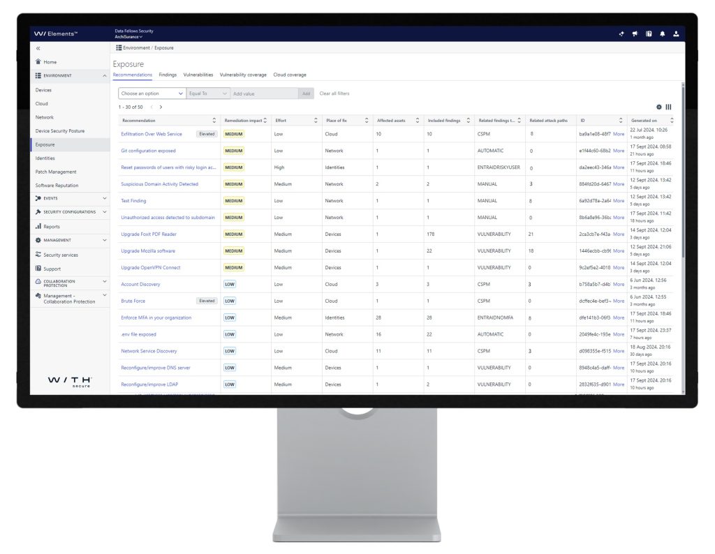 Innovatiivinen ja tekoälyä käyttävä WithSecure™ Elements Exposure Management (XM) vastaa näihin haasteisiin tarjoamalla kattavat altistumisten hallintatyökalut. WithSecure on Euroopan johtava altistumisten hallinnan tarjoaja PK-yrityksille, it-palveuiden tuottajille sekä organisaatioille, jotka haluavat eurooppalaista kyberturvallisuutta. Elements XM tarjoaa ominaisuuksia ja prosesseja, jotka arvioivat, kuinka saavutettavia ja altistuneita organisaation digitaaliset omaisuudet ovat, ja kuinka helppoa niitä on hyödyntää. Ratkaisu tarjoaa jatkuvia suosituksia simuloimalla hyökkäyspolkuja, tunnistamalla kriittiset haavoittuvuudet ja tarjoamalla riskikeskeisiä ratkaisuja puolustuksen proaktiiviseen vahvistamiseen.